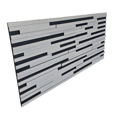Met afmetingen van 120×60 centimeter en latjes variërend in dikte van 1,5 tot 2,4 centimeter, creëren deze panelen een dynamisch 3D-effect. De latjes zijn op een akoestische vilten basis geplaatst, wat zorgt voor uitstekende geluidsabsorptie en een stijlvolle uitstraling.